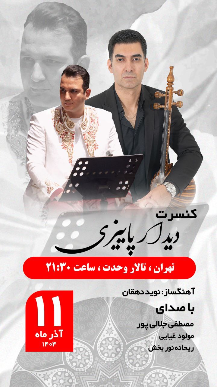 سید مصطفی جلالی پور هنرمند مزینانی در سومین کنسرت موسیقایی خود در سال 1404 این بار در مهمترین مرکز هنری پایتخت با دیدار پاییزی در تالار وحدت هنرنمایی می کند.